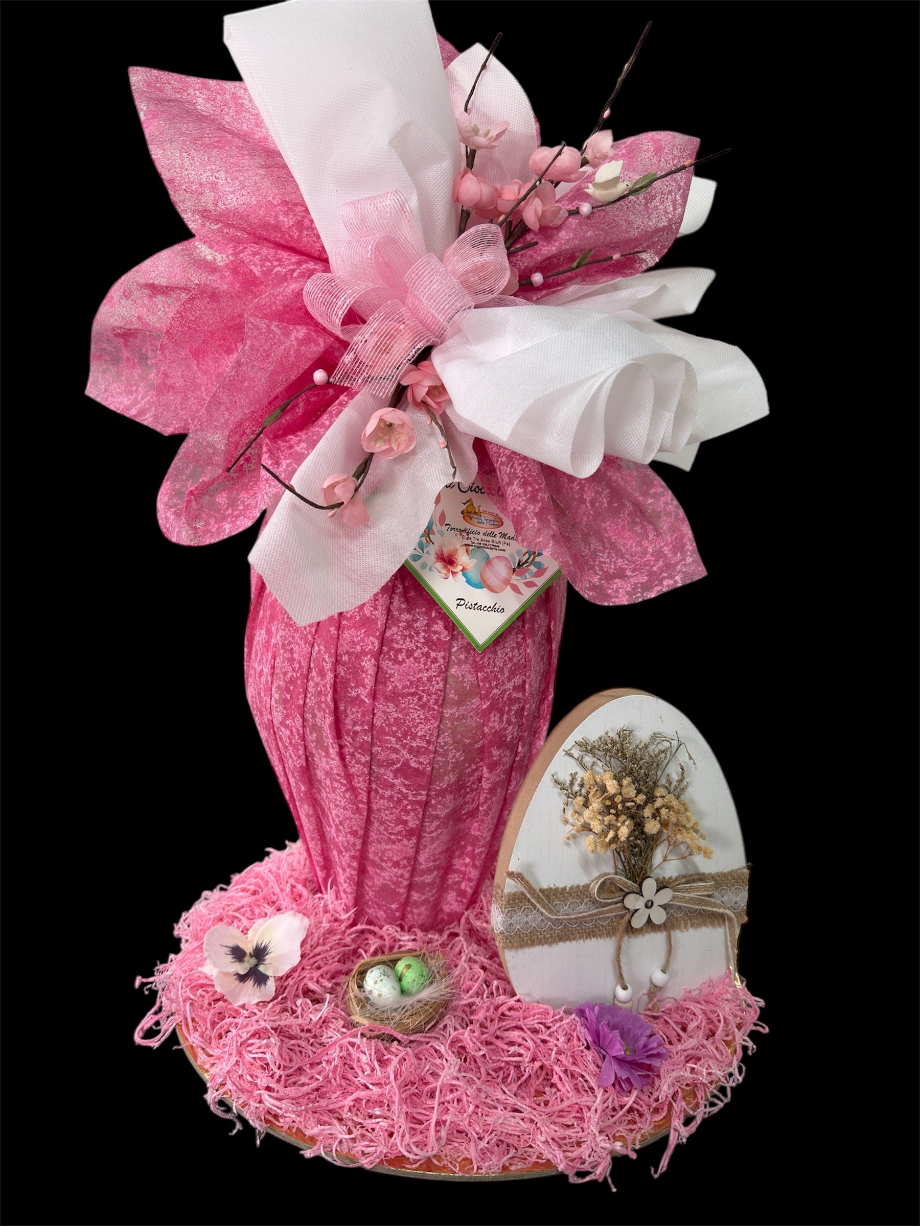 Uovo di Pasqua artigianale da 700 g, confezionato in elegante composizione decorativa nei toni del rosa, realizzata interamente a mano.